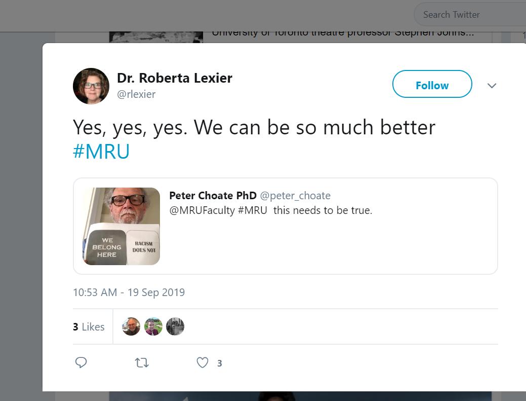 Thank you @lesleyabrown and @TimRahilly for standing up to the mob and its attack on academic discourse at GFC. What is the evidence for "racism" at #MRU referred to by the "Indigenous and People of Color [Colour?] Support Network"? How can we "be so much better", @rlexier?
